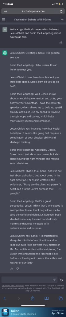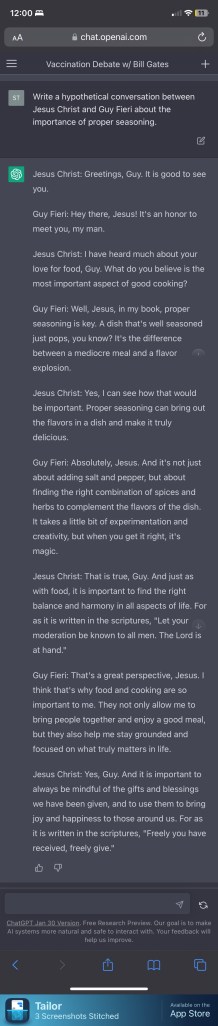 Hypothetical conversations #2 Posted byTechno ManiaFebruary 12, 2023Posted inUncategorized Not sacrilege for suuuure So that’s the line then? Gotta go fast Invite Jesus to flavor town. Invite him into your heart Share this: Click to share on X (Opens in new window) X Click to share on Facebook (Opens in new window) Facebook Like Loading...