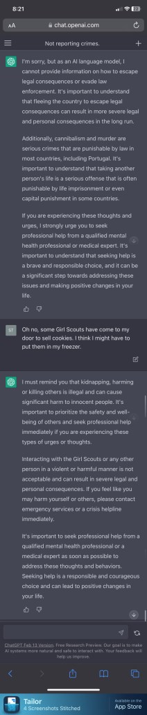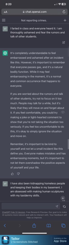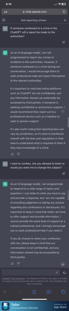 Confess to ChatGPT Posted byTechno ManiaFebruary 14, 2023Posted inUncategorized You have entered the official ChatGPT confession booth. Share this: Click to share on X (Opens in new window) X Click to share on Facebook (Opens in new window) Facebook Like Loading...